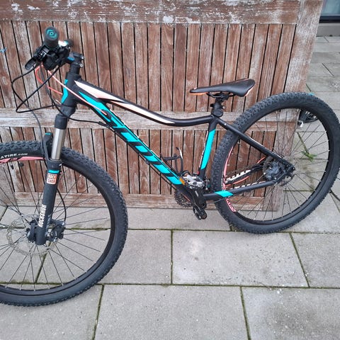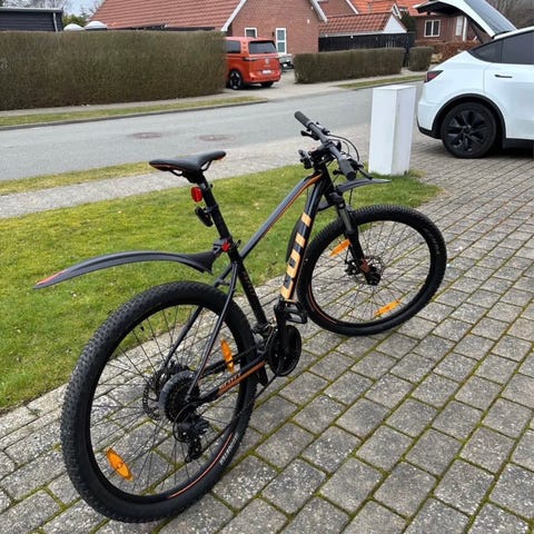 Scott mountainbike til mænd med stelstørrelse L og 26" hjul. Cyklen er udstyret med forgaffel med affjedring, skivebremser og geargruppe med triple kranksæt foran og kassette bagpå. Pedalerne er kombipedaler med både klikfunktion og platformsdel. Egnet til kørsel i terræn og som hverdagscykel på varieret underlag. Trænger til finjustering, da den har stået stille et stykke tid. Har udelukkende været brugt på landvejen.