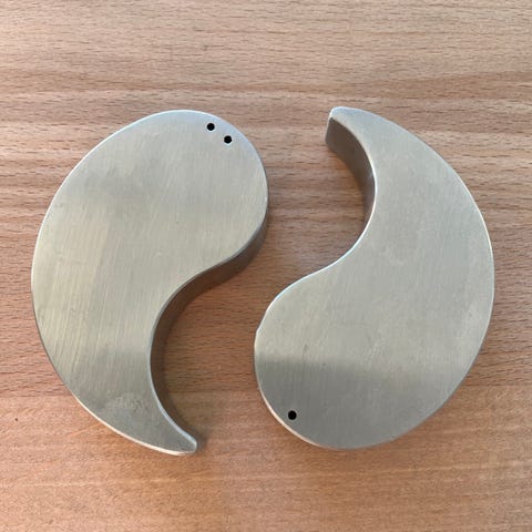 Sættet består af to sammenhængende beholdere, formet som Yin & Yang, og beregnet til henholdsvis salt og peber.
