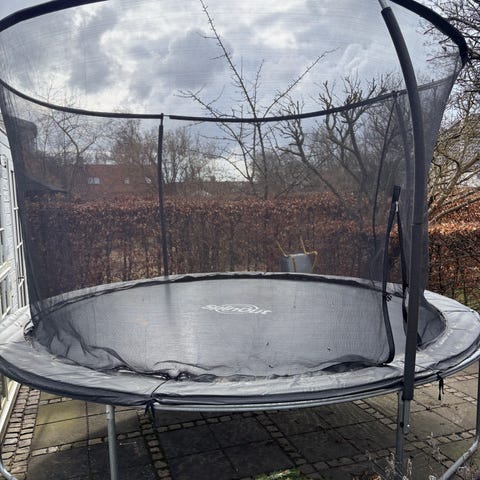 Rund trampolin med sikkerhedsnet og stige. Adgang sker via en åbning i nettet med tilhørende stige, lynlåsen er gået i stykker, men der er klips som holder åbningen rimelig lukket. Velegnet til leg og hop for børn under opsyn af voksne.