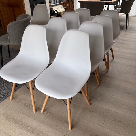 4 spisebordsstole. Konstruktionen på dem er god, men de er brugt af børn i et par år, og det kan også ses, så de skal lige have en kærlig hånd :)
