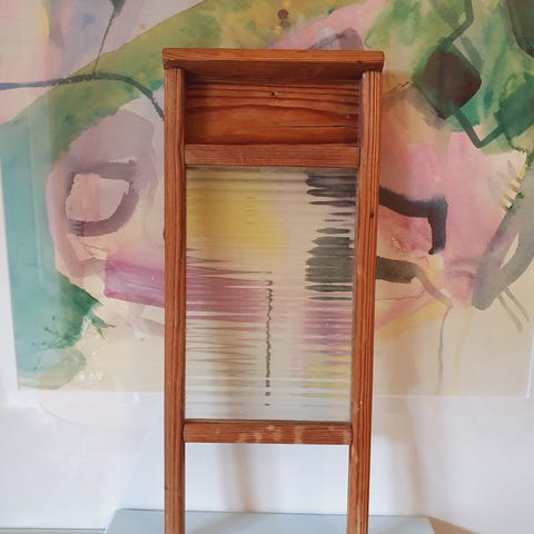 Dekorativt retro vaskebræt i træ med bølget vaskeflade i zink.