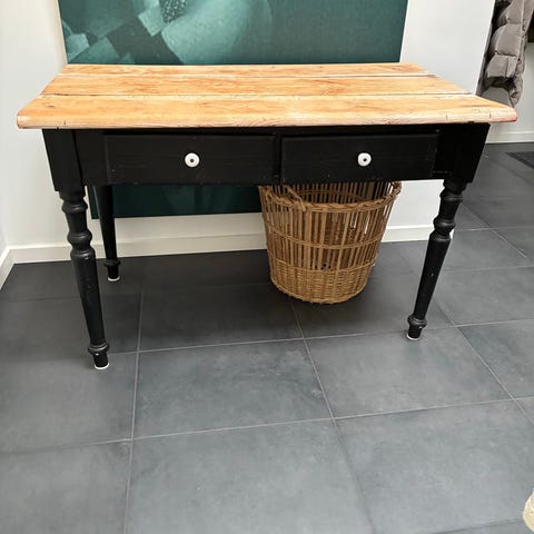 Træbord med to skuffer i rødmalet træ. Bordet har rektangulær bordplade og massive ben med dekorative udskæringer under skufferne. Overfladen fremstår med synlig patina og slid i malingen. Velegnet som sofabord, sidebord eller lille konsolbord med opbevaringsplads i skufferne.