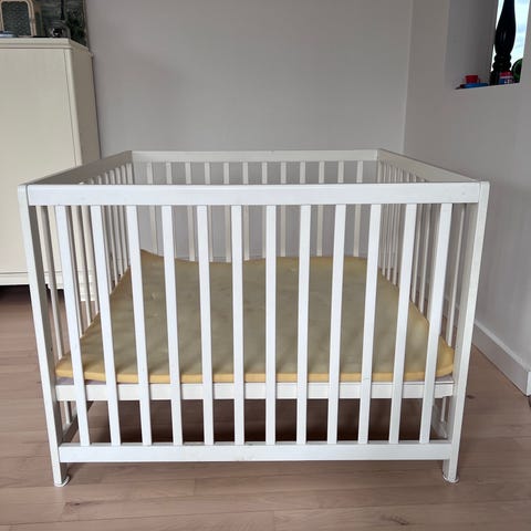 Med hjemmelavet pind til sengehimmel. Købt december 2024. 100x100 + madras og sengehimmel