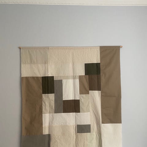 Vægkunst i form af et tekstilbillede med geometrisk mønster i beige og hvid. Billedet består af spændte tekstilbånd på en neutral baggrund, indrammet i en lys træramme. Udtrykket er enkelt og grafisk og egner sig til ophæng i fx stue, soveværelse eller kontor. Kan kombineres med andre billeder i lignende stil for et sammenhængende udtryk på væggen.