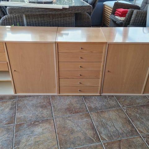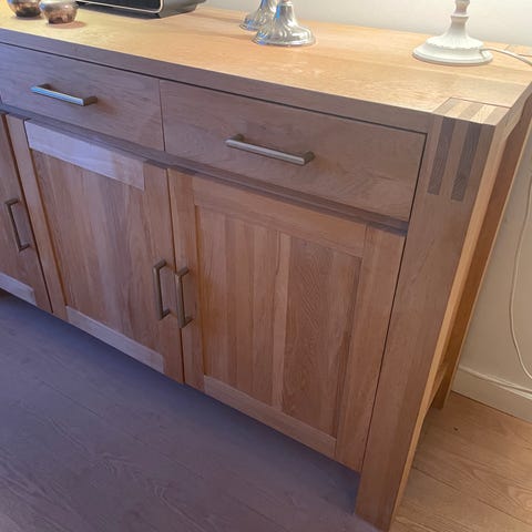 Skænk i træ med buet front. Møblet har to øverste skuffer samt to nederste skabslåger med nøglehuller. Overfladen fremstår med tydelig træstruktur og blank finish. Egnet til opbevaring i stue, spisestue eller entré, hvor der er behov for både skabsplads og bordplade til fx lamper eller dekoration.