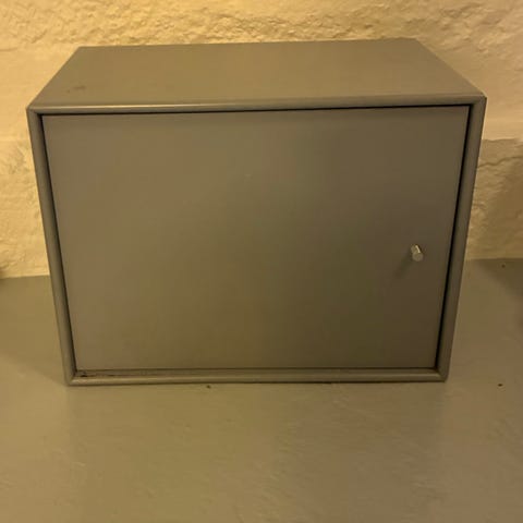 Rullebord i gråmalet metal med fire hjul. Øverst er der en udtræksskuffe med indsats og flere rum til opbevaring af småting. Under skuffen er der en åben hylde samt et skab med låge i bunden. På siden er der et håndtag til at skubbe bordet. Velegnet som opbevaringsmøbel i fx kontor, værksted eller børneværelse.