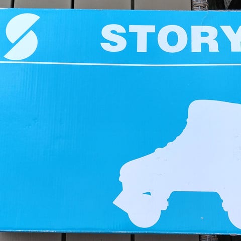Story Duster rulleskøjter i størrelse EU 35. Klassiske side-by-side rulleskøjter med snørelukning. Overdel i blå og lyserød tekstil/syntetisk materiale med polstret skaft for støtte omkring anklen. De er brugte men er i fin stand - ikke meget slid på hverken bremseklodser eller hjul.