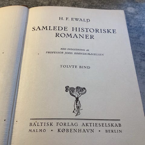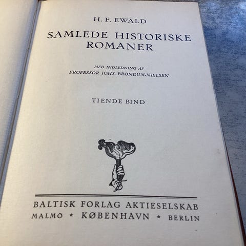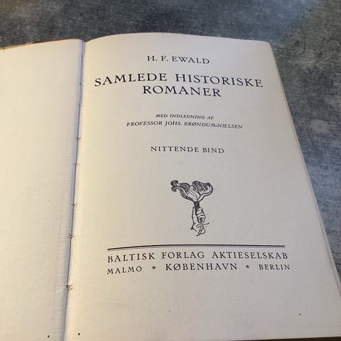 H. F. Ewald Samlede historiske romaner bog, andet bind. Udgivet af Baltisk Forlag Aktieselskab i København, Malmø og Berlin. Indbundet udgave med ryg og hjørner i læder og marmorerede kartonpermer. Indeholder historiske romaner af H. F. Ewald med indledning af professor Jens Kr. Andersen. Velegnet til samlere af ældre danske litterære værker og historiske romaner.