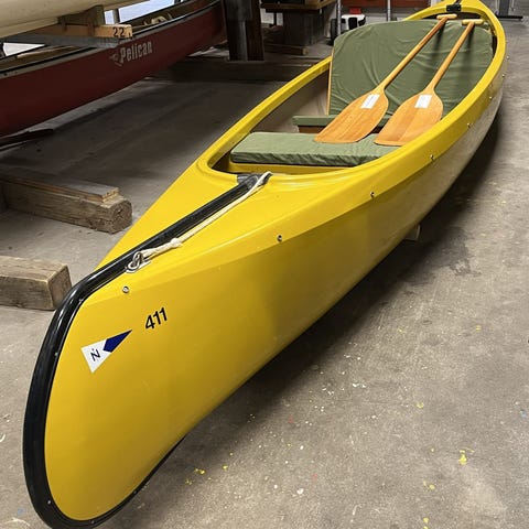 Venture Ranger 14 kano i grøn farve. Kanoen har to sæder med træramme og flettet remsæde. Skroget er i plastmateriale med sorte lister langs rælingen. Velegnet til ro- og friluftsture på søer og rolige vandløb. Længden er 14 fod, som giver god plads til personer og oppakning.