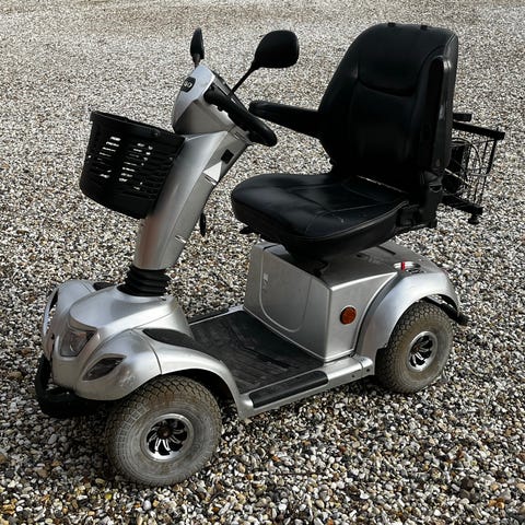 Flot og velholdt El-scooter med 4 hjul i brun farve. Modellen har polstret sæde med høj ryg og nakkestøtte samt armlæn. Der er monteret kurv foran til opbevaring samt to bakspejle på styret. Instrumentpanelet har display og betjeningsknapper placeret centralt. Scooteren er udstyret med LED lys for og bag. På ryglænet er der på billederne monteret en refleksvest for øget synlighed. Velegnet som hjælpemiddel til persontransport på fortove og tilsvarende underlag.