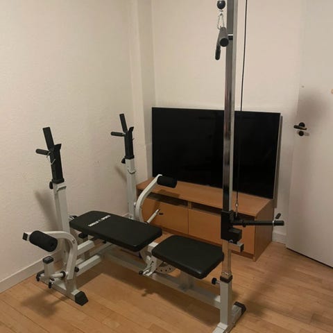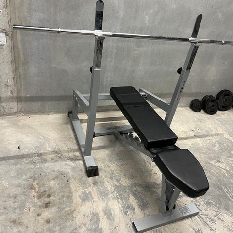Kvalitets træningsbænk med vægtstænger og vægtskiver