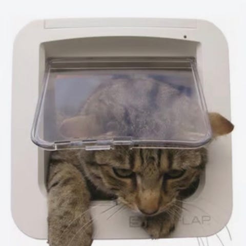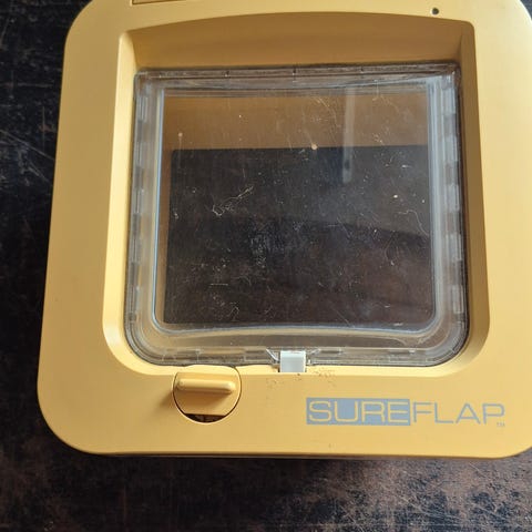 Sureflap, kattelem.Kattelem med microchiplæser & 4-vejs-lukning, op til 32 chipnumre, magnetlås, anvendelig med halsbåndvedhæng, til alle døre og glas. Gennemgangsstørrelse ca. B 14 x H 12 cm. Leveringsomfang, se foto. Lysgulnet. Sælges da hankatten er vokset ud af den, og derfor skal have en større.