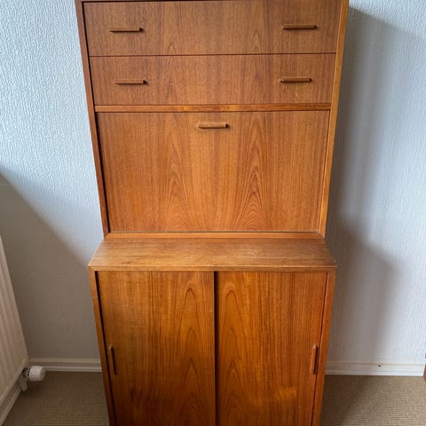 Teak reol med 7 hylder (vises på billede med 6 hylder). Mål er største dybde 48 cm og 196 cm høj. De smalle hylder er 20 cm dybe. Fin alsidig reol til bøger m.m. på de smalle hylder samt musikanlæg/tv m.m. på den brede hylde.