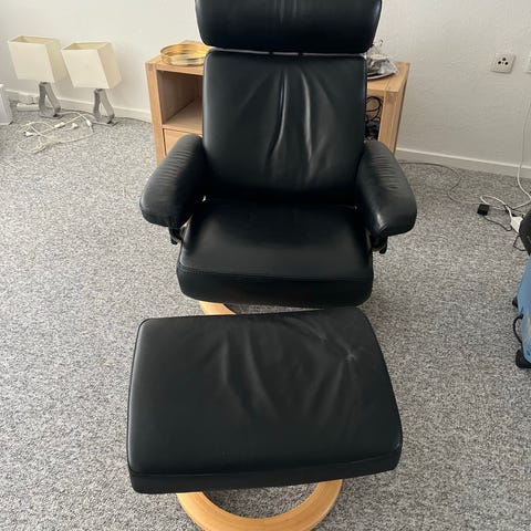 Rigtig fin læder lænestol med 2 motorer for både ryg og fodhviler. På drejefod. Og med 3 meter ledning.