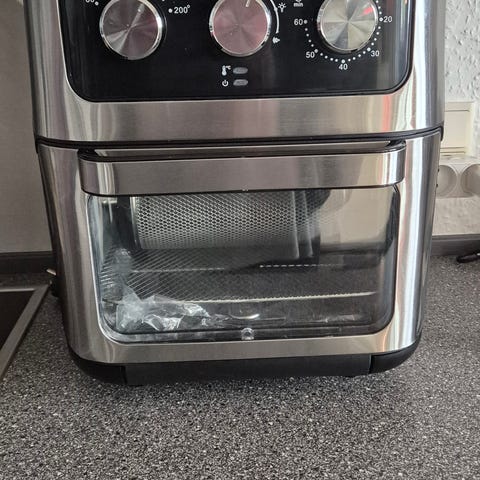 Salling Air Fryer Oven i sort. Bordovn med airfryer-funktion og front i glas med metalhåndtag. Kontrolpanel med drejeknap og touchknapper på fronten. Medfølgende tilbehør inkluderer roterende kurv og bageplader/riste, som ses på billederne. Oplysninger på typeskilt: model Air Fryer Oven, effekt 1700 W, 220–240 V ~ 50/60 Hz. Velegnet som kombineret miniovn og airfryer til tilberedning og opvarmning af mad i køkkenet.