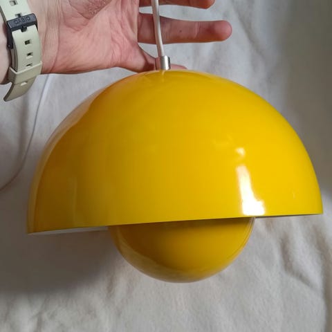 &Tradition Flowerpot pendel i hvid. Designet af Verner Panton. Lampen har en halvkugleformet yderskærm og en mindre indvendig skærm, som giver et blændfrit og nedadrettet lys. Velegnet som belysning over spisebord, køkkenbord eller i stue og entré. Leveres med hvid baldakin og hvid ledning til montering i loftudtag.