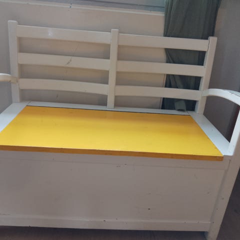 Rigtig fin og charmerende bænk af patineret og udskåret træ, rum under sæde. Alm aldersrelaterede brugsspor