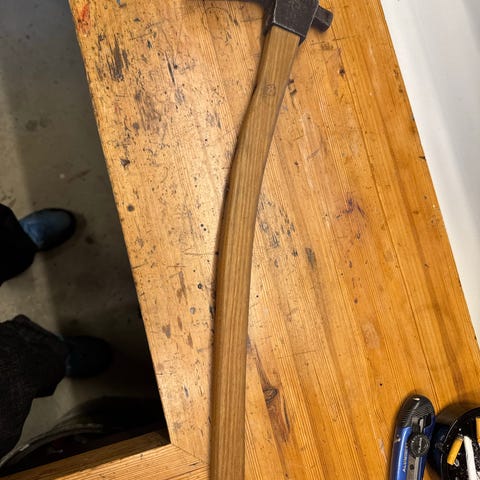 langt træskaft og hoved i metal. Hammerhovedet har en flad slagflade i den ene ende og en spids/kileformet ende i den anden, egnet til smedearbejde, formning af metal eller andet grovere arbejde. Skaftet er udført i træ og er let buet for bedre greb. Velegnet som håndværktøj i værksted eller smedeværksted.