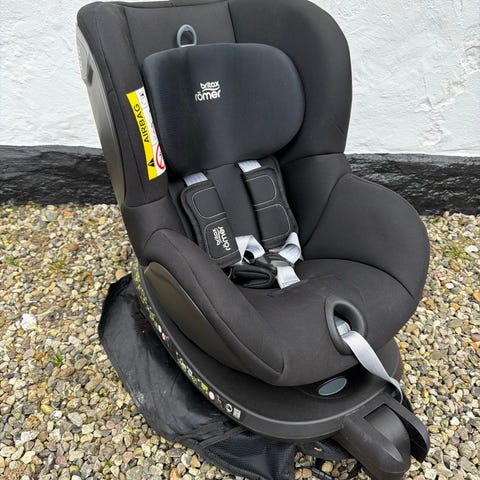 Britax Römer autostol Dualfix Cosmos 0-18 kg. Autostolen har sort polstring/betræk og lys base. 5-punktssele, justerbar hovedstøtte og selepuder. Stolen har støtteben og frontbøjle. Babyindsatsen mangler, så måske den er bedst egnet fra ca 6 mdr. Den kan være både bag- og forudrettet, kan drejes 360 grader og kan også justeres ifht om barnet skal sidde ret eller ligge ned. Betræk er pænt og nyvasket, men der er brugsspor på den lyse plastik. Fra hjem uden dyr og røg og selvfølgelig ikke været involveret i uheld.