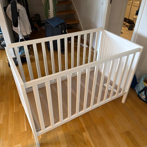 Hvid klassisk tremmeseng med tremmer på langsiderne og lukkede gavle. Egnet til standard babymadrasstørrelse af modeltype fra IKEA. (madras medfølger ikke). HBL 85x67x125