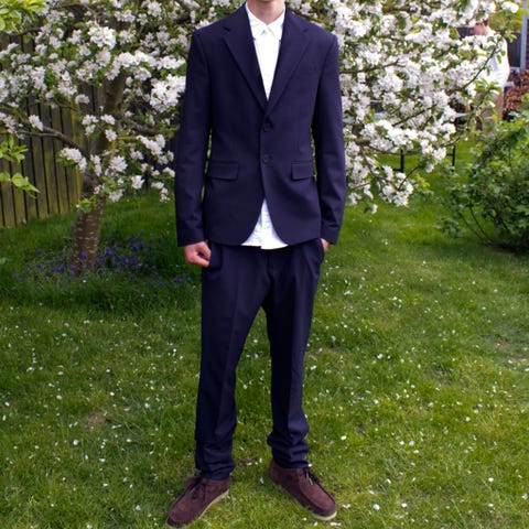 Jakkesættet består af jakke og bukser i dyb blå matchende farve og materiale.