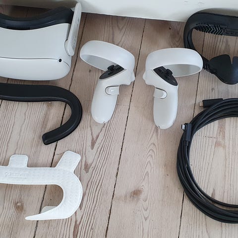 Oculus Quest 2 VR-headset i hvid med tilhørende håndcontrollere. Sættet omfatter VR-brille, to controllere med håndledsremme samt en hård bæretaske med formstøbt indmad til opbevaring og transport af udstyret plus Elite strap. . Velegnet til brug med understøttede VR-oplevelser, spil og multimedieindhold. 128 gb og en værdi på 2750😃