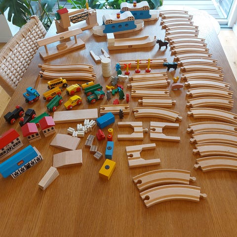Større BRIO togbane træsæt i klassisk træ. Sættet består af buede og lige skinner, broer, tunneller og klippeelementer samt flere tog og vogne i forskellige farver. Der medfølger også en station/rampe i træ med grøn overdækning. Togbanen kan samles på flere måder og kan kombineres med andre BRIO trætogdele i samme system. Velegnet til leg på gulv for børn, der kan lide at bygge og køre tog.