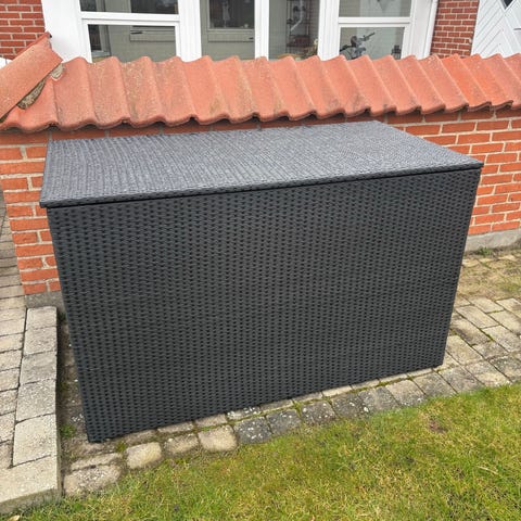 Plast opbevaringsboks til udendørs brug i grå farve. Vandtæt m/ m trækhåndtag.Kassen har hængslet låg og er egnet til opbevaring af eksempelvis hynder, puder eller andet haveudstyr. Fremstillet i hård plast, som kan stå udendørs på terrasse eller altan. Indvendigt er der god længde og højde til aflange genstande som liggestolshynder.