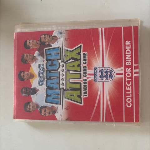 Topps Match Attax samlemappe til fodboldkort. Mappen indeholder plastlommer med indsatte Match Attax fodboldkort fra en Premier League-sæson. Kortene er organiseret i mappernes lommer og viser forskellige spillere og hold. Velegnet til opbevaring og organisering af Match Attax samlekort samt udbygning af en eksisterende samling.