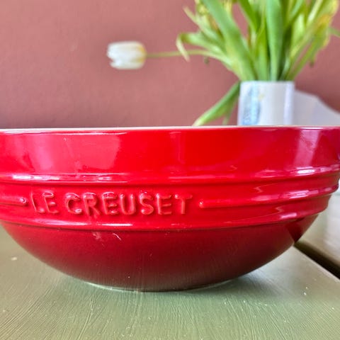 Ydersiden er rød med Le Creuset-logo, indersiden er lys/cremefarvet. Velegnet som serveringsskål til salat, frugt eller andre retter i køkken og på bordet.