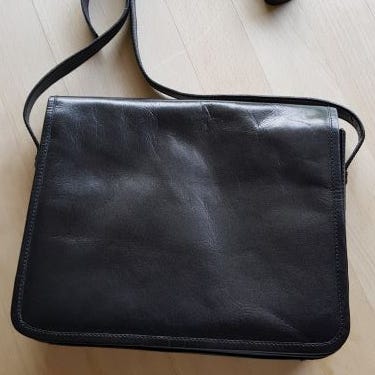 Skuldertaske, andet mærke, kalveskind, Sort skindtaske af mærket Gemini fra Italien.