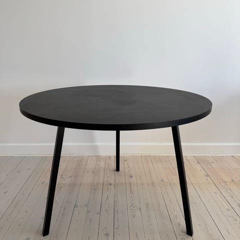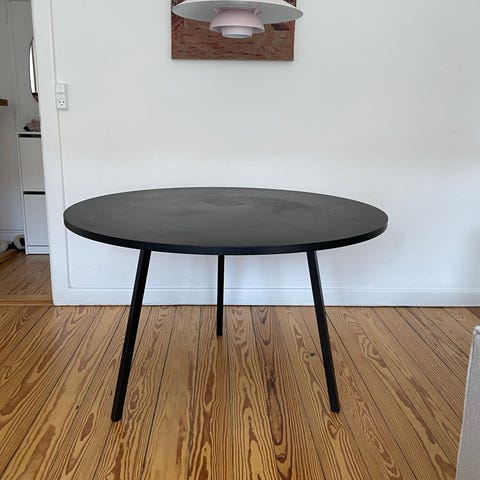 Hay about a table rundt - er blevet beskadiget. Kan fikset med lidt vilje. Kanterne har fået skader, stellet har også en dims der er knækket.
