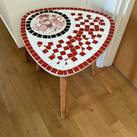 Mosaikbord brugt på altan. Købt i Notre Dame butikken i Kbh ca 2 år siden til 1400 kr. der ses brugsspor på siden, i form af at malingen er skallet af, men det har ingen indflydelse på selve funktionen.