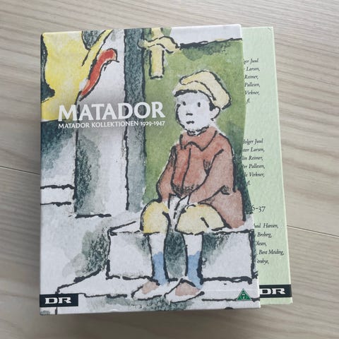 DR Matador Matador Kollektionen 1929-1947 dvd-boks. Samling af tv-serien Matador i en samlet kollektion, der dækker årene 1929-1947. Indeholder serien på dvd i en samlet boks med omslag med illustration fra serien. Velegnet til afspilning på dvd-afspillere, der understøtter regionen angivet på udgivelsen.