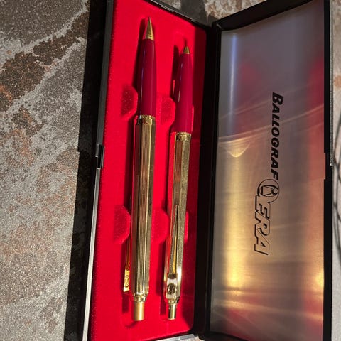 Ballograf sæt bestående af kuglepen og stiftblyant i rolled gold (forgyldt). Sættet leveres i original æske med indvendig holder til skriveredskaberne. Kuglepennen og stiftblyanten har matchende design og er velegnede til samlere eller daglig skrivning/kontorsæt.