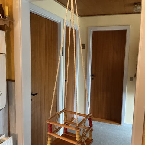 børnegynge i træ. Gynge udformet som en lille hest med ryglæn og frontbøjle i lyst træ. Ophæng med fire snore til montering i loft eller bjælke. Sædet er polstret med løst skind/plys, som kan tages af efter behov. Velegnet til mindre børn, der kan sidde selv, til brug indendørs i børneværelse eller opholdsrum. Brugeren kan justere ophængets længde ved at tilpasse snorene til den ønskede højde.
