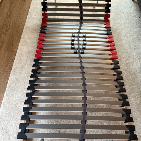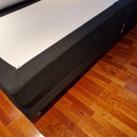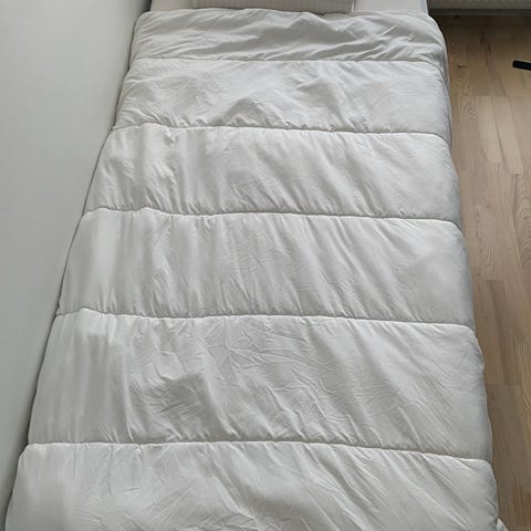 Fin sengebund fra IKEA 90x200 cm med stål ben . Hvidt bomulds betræk høre til. Hentes i Charlottenlund