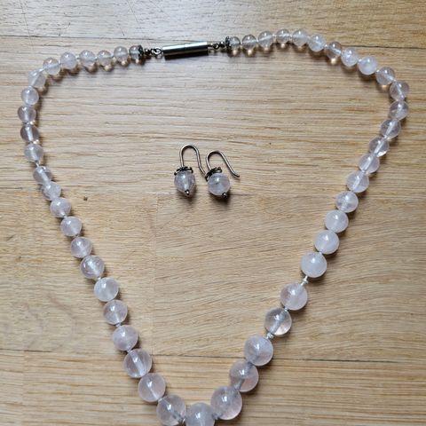 Fint sommersæt med øreringe og halskæde i Rosenkvart og oxyderet sølv. Smuk lås.