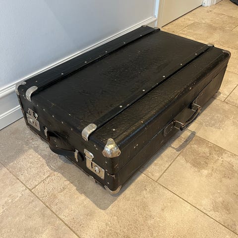 Fed gammel kuffert i kraftigt læder med remme.