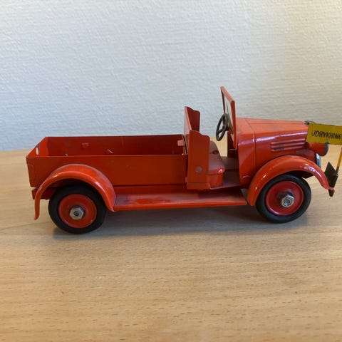 Falck modelbil reservedele i rødmalet metal. Delene omfatter blandt andet karrosseri, førerhus, skærme, lad og projektørdel. Egnet som reservedele eller til reparation og opbygning