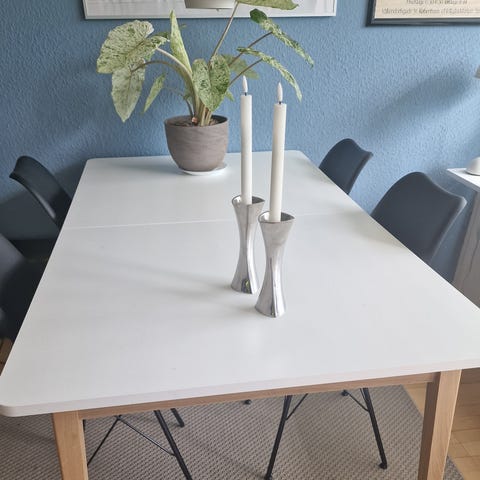 Jysk Birkelse Spisebord. Bordet er i god stand. Normal bredde er 160 cm. Når den hvide tillægsplade er i brug, udvides bordet til en bredde på 200 cm. Det giver dig ekstra god plads, når du får gæster. Skal hentes på Amager :)