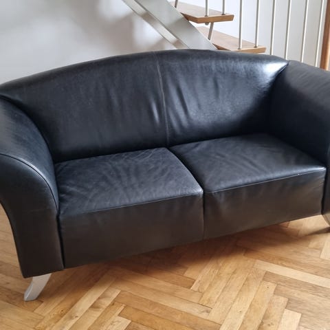 Sofa sæt bestående af to lædersofaer i sort. Sættet omfatter en mindre og en større sofa med polstrede armlæn og ryglæn. Sofaerne har glat sæde- og rygpolstring samt bløde hynder, der giver støtte ved siddende brug. Egnet til stue eller opholdsrum, hvor der er behov for flere siddepladser.