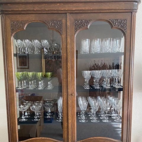 Flot Antik vitrineskab i mørk bejdset Egetræ med udskæringer.,Afhentes i Grenå