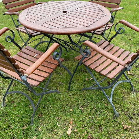 Sæt med havebord og havestole i metal. Det ene sæt består af rundt bord med metalstel og to stole med metalsæder, begge dele med tydeligt rustpræg og patina. Det andet sæt består af rundt metalbord og to stole i sortlakeret metal med dekorativt, gennembrudt mønster i sæde og ryglæn. Egnet til udendørs brug i have, gårdhave eller altan afhængigt af plads og behov. Materialet er metal, og overfladerne fremstår med brugsspor og patina, som ses på billederne.