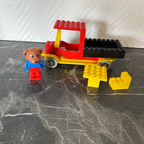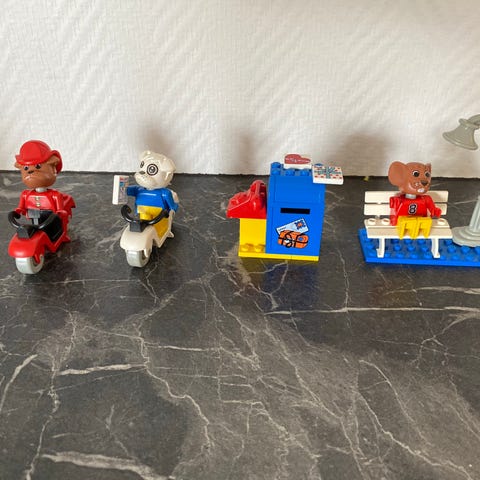 LEGO DUPLO Fabuland politibil med to Fabuland-figurer. Sættet består af en blå og gul bil med førerhus og antenne samt to dyrefigurer i Fabuland-stil, herunder en politifigur og en figur med maske. De store DUPLO-klodser og figurer er velegnede til mindre børn og kan kombineres med andre LEGO DUPLO- og Fabuland-sæt for udvidet legemulighed.