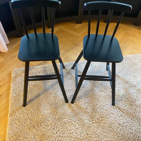IKEA AGAM børnestol i sortmalet træ. Klassisk børnestol med ryglæn med lodrette tremmer og firkantet sæde. Egnet til brug ved børnebord eller som ekstra siddeplads på børneværelset eller i køkkenet. Stolen er udført i træ og har skråtstillede ben for stabilitet. Pris pr. Stol er 200 kr. Køb alle 3 for 500