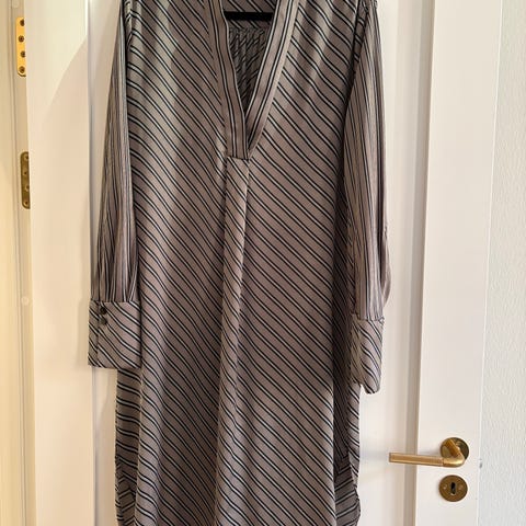 By Malene Birger hverdagskjole i str. M. Kjolen er fremstillet i polyester og har en ensfarvet beige tone. Modellen har V-udskæring og trekvartlange ærmer. Velegnet som enkel hverdagskjole til kvinder.