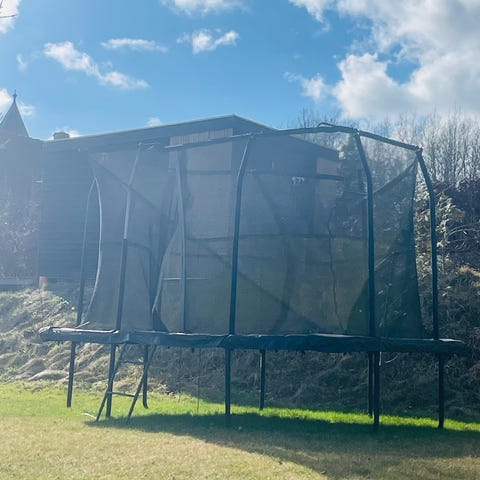 Stor trampolin 4 meter bred. Købt i Davidsen for ca. 3 år siden. Den er lidt grøn på dugen, men det kan vaskes med.