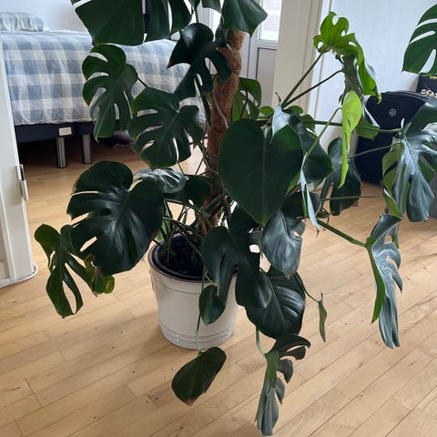 Monstera deliciosa (fingerphilodendron) stueplante i grøn med store, fligede blade. Planten er opbundet til en mosstok for støtte og har flere stængler i samme potte. Velegnet som indendørs plante i stue eller andre lyse rum med indirekte sollys. Kræver jævn vanding og veldrænet pottejord. Leveres i potte som vist på billederne. Planten er 3 år gammel.