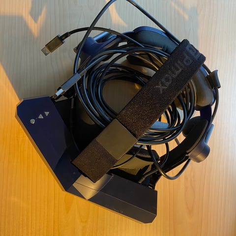 Pimax VR-headset i sort med tilhørende håndcontrollere. Headsettet har justerbare stropper og kabelføring til tilslutning af pc. Leveres med original æske fra Pimax. Velegnet til virtual reality-brug, fx spil og simuleringer.